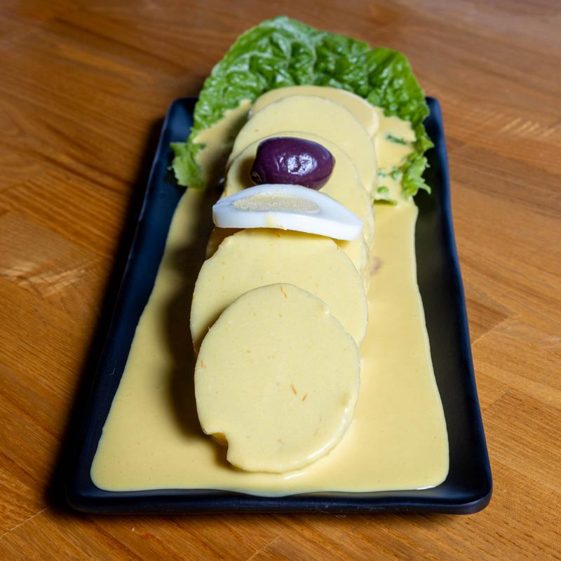 Steamed potatoes covered in our house-made aji amarillo sauce, topped with purple olives and hard boiled egg.