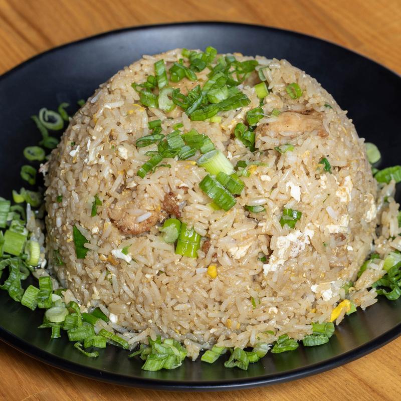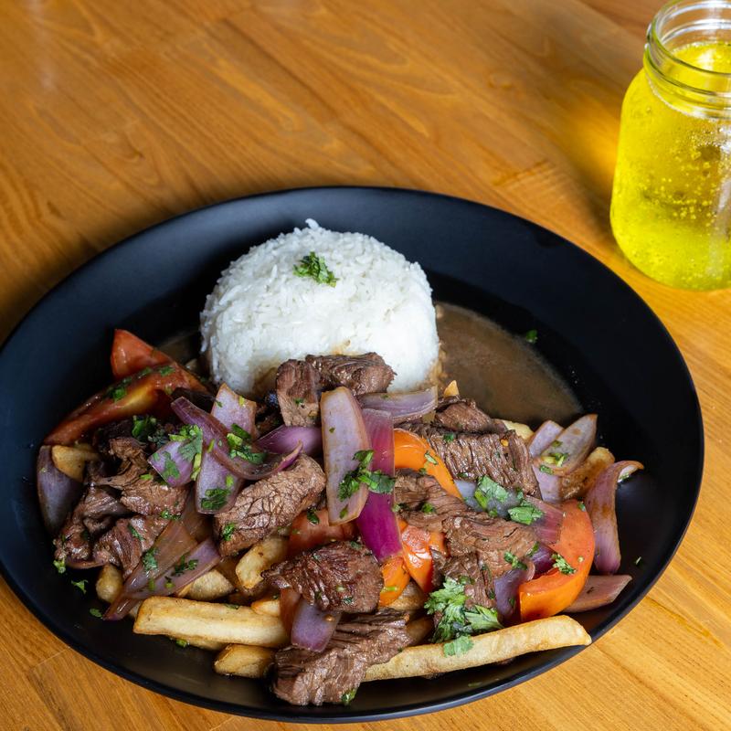 From the wok • Marinated protein sautéed with soy sauce, red wine vinegar, red onions, and tomatoes. Served on a bed of fries with a side of steamed rice.